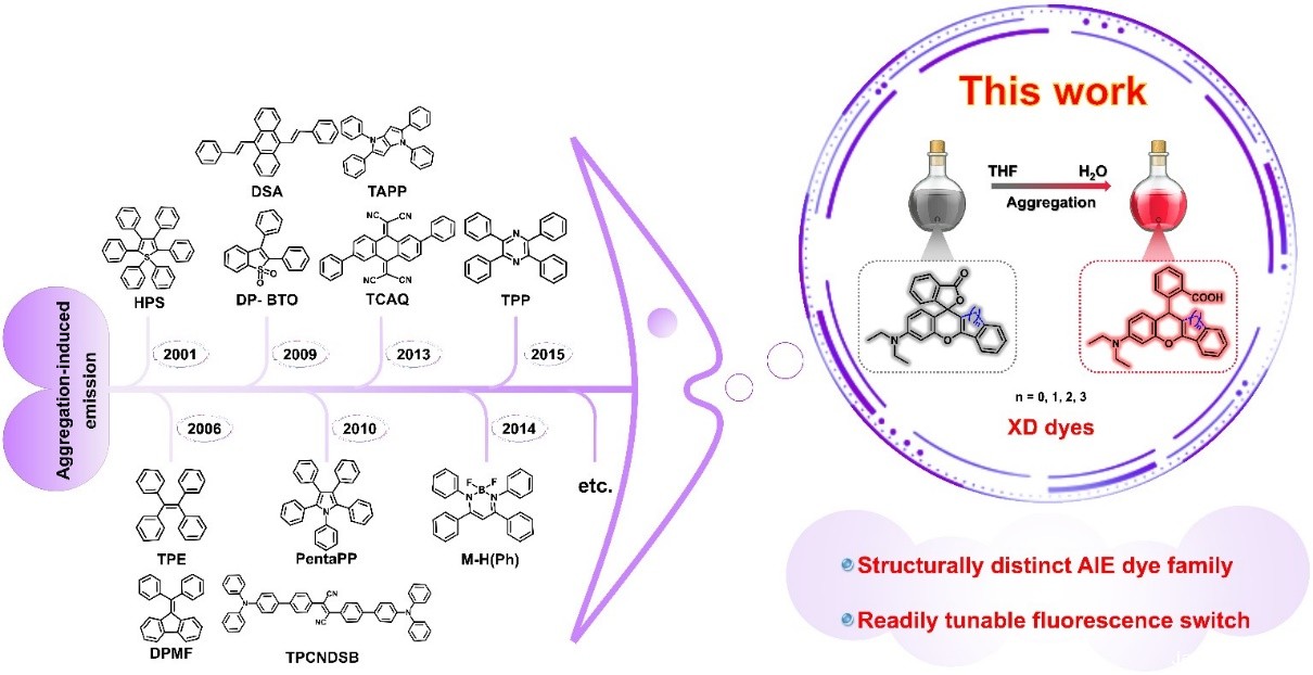 聚集诱导发光(AIE)染料区别于传统发光材料,其通常在稀溶液中表现出微弱或无荧光发射,但在聚集体或固态中荧光发射增强。这一特性有效克服了传统荧光染料在聚集状态下易发生荧光淬灭的局限性,使其在生物医学成像、光电材料等领域独具应用潜力。然而,传统AIE分子在荧光开关的调控方面仍存在一定局限性,开发结构可调、性能稳定的荧光染料成为该研究领域的迫切需求。