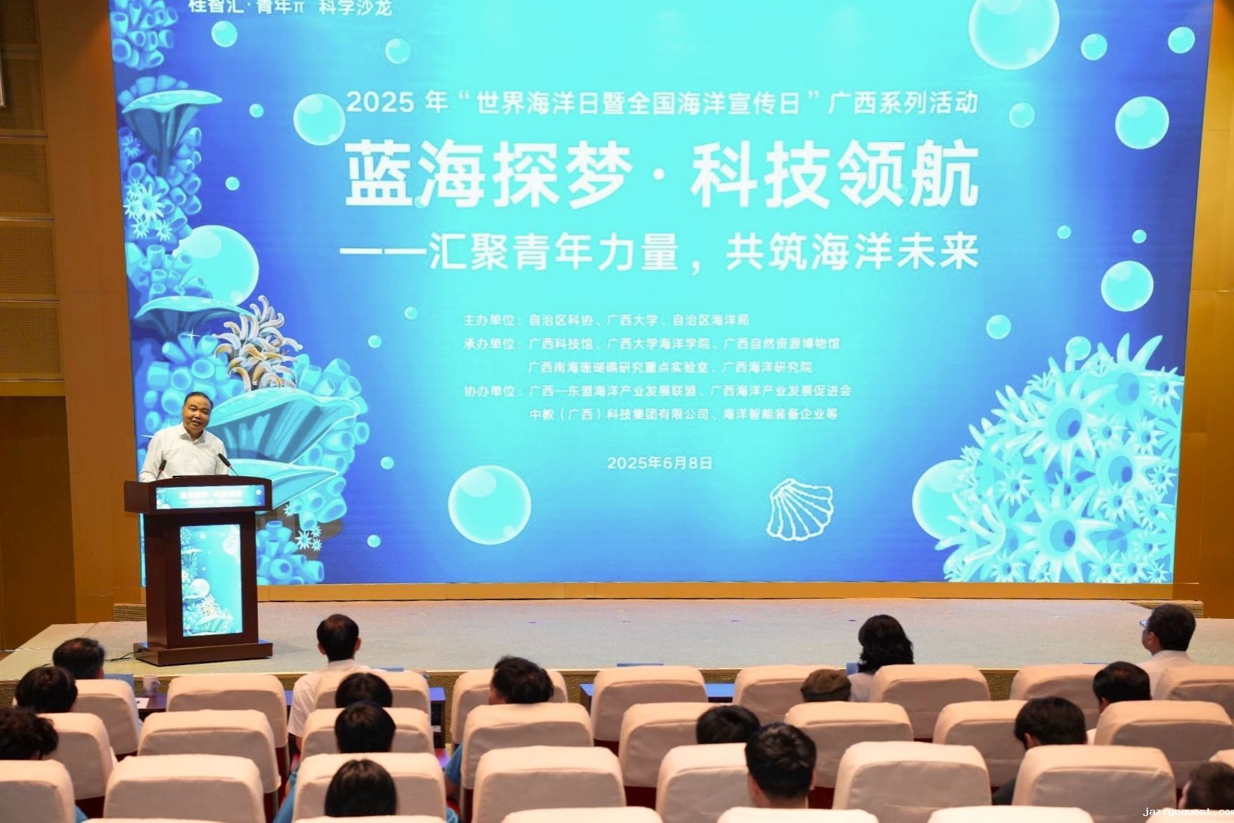 6月8日,我校与自治区科协、自治区海洋局联合在南宁和北海举办2025年“世界海洋日暨全国海洋宣传日”广西系列活动。自治区科协副主席黎宁出席活动,并为广西珊瑚礁普查志愿服务队授旗,启动2025年“广西珊瑚礁普查行动”。校党委常委、副校长肖建庄出席活动。