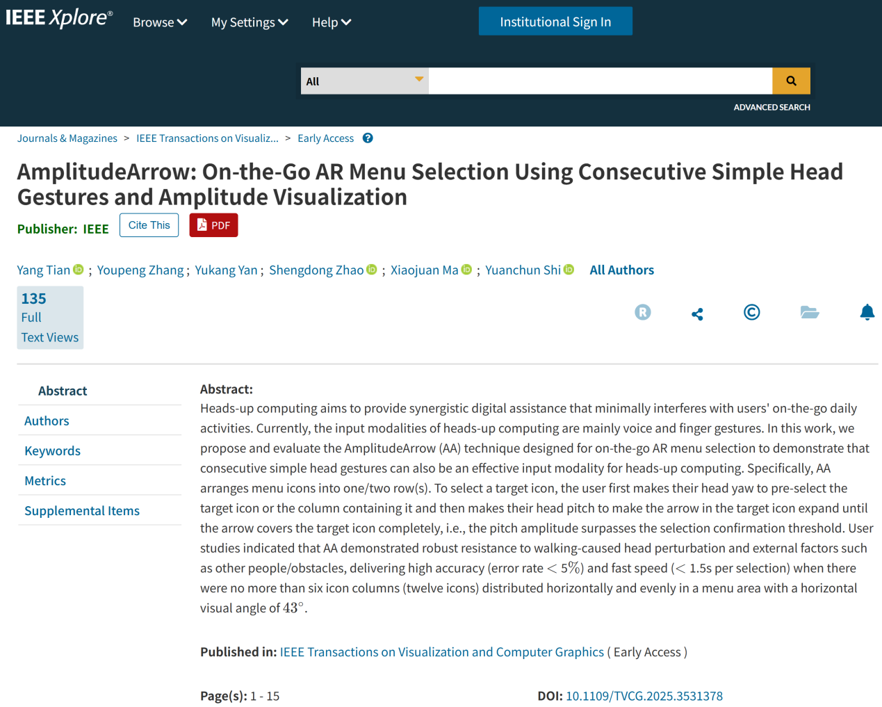 第三项研究成果旨在帮助上肢功能障碍用户仅通过简单的头部旋转动作高效地与XR操作系统界面进行交互。在本研究中,该团队提出并评估了一种适用于行走过程的、仅依赖连续简单头部旋转动作的XR操作系统界面交互技术AmplitudeArrow。AmplitudeArrow技术通过对二维头部指向(pointing)任务进行降维,将一个维度的头部旋转动作用于选择确认(selection confirmation)任务,从而有效抵消行走过程中的头部晃动。用户研究结果显示,在图标水平分布不超过六列(共十二个图标)且XR眼镜水平视场为43度的条件下,AmplitudeArrow技术能够有效抵消因行走及外部因素(如其他人或障碍物)引起的头部晃动,实现高准确率(错误率低于5%)和较快的选择速度(每次选择少于1.5秒)。