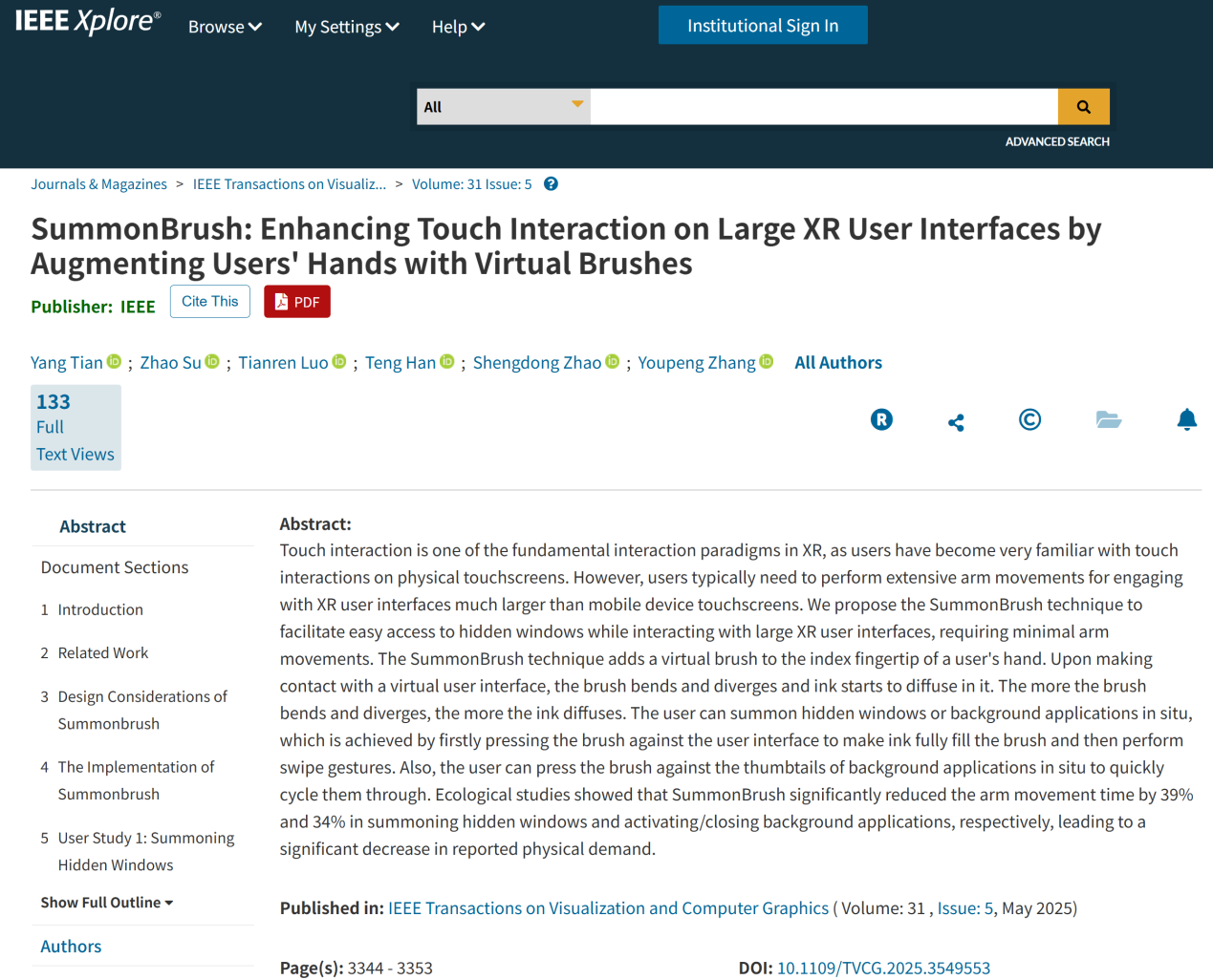 近日,我校扩展现实(XR)人机交互团队在XR操作系统图形用户界面领域取得了三项创新研究成果。研究成果分别以"SummonBrush: Enhancing Touch Interaction on Large XR User Interfaces by Augmenting Users' Hands with Virtual Brushes","BoundaryScreen: Summoning the Home Screen in VR via Walking Outward"和"AmplitudeArrow:On-the-Go AR Menu Selection Using Consecutive Simple Head Gestures and Amplitude Visualization"为题陆续发表于IEEE Transactions on Visualization and Computer Graphics期刊上。这三篇研究成果的第一作者和通讯作者为我校计算机与电子信息学院副教授田阳,第一完成单位均为taptap苹果安装。