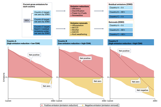 在第二个政策设计中,净零政策中纳入了固定的源头减碳目标(与CDR分开),此时并行部署的CDR仅作为补充而非取代脱碳。根据这一设计,一个国家可以自由选择高或低CDR路径,只要部署的CDR足以实现净零目标即可。尽管国家A和国家C均在2060年达到相同的剩余排放水平,但国家C通过积极的CDR部署,能够更早地实现净零排放并过渡到净负排放。因此,CDR既可以推迟减排速度,延长超调时间,也可以与快速脱碳相结合,作为加速实现净零和净负排放、缩短温度超调期的关键工具。