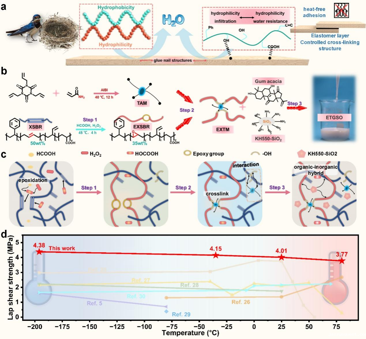 该研究灵感来源于鸟巢蛋白的交联机制,通过对羧基化苯乙烯-丁二烯乳胶进行原位环氧化改性,将非极性双键转化为高度反应性的环氧基团。结合多氨基预聚物、改性二氧化硅和环氧改性乳液,构建出了一种双物理-化学交联系统,成功开发出一种新型冷压胶粘剂。该胶粘剂表现出优异的干湿剪切强度(4.03/1.96 MPa)和脱粘功(2.47 J),并在极端温度范围(-196至85°C)内保持强度损失低于7%,在低温脆性方面也显著改善(-196°C时强度保持在3.67 MPa)。此外,该材料具有持久的溶剂抵抗能力(浸泡36天后强度保持率为70%)以及阻燃特性。