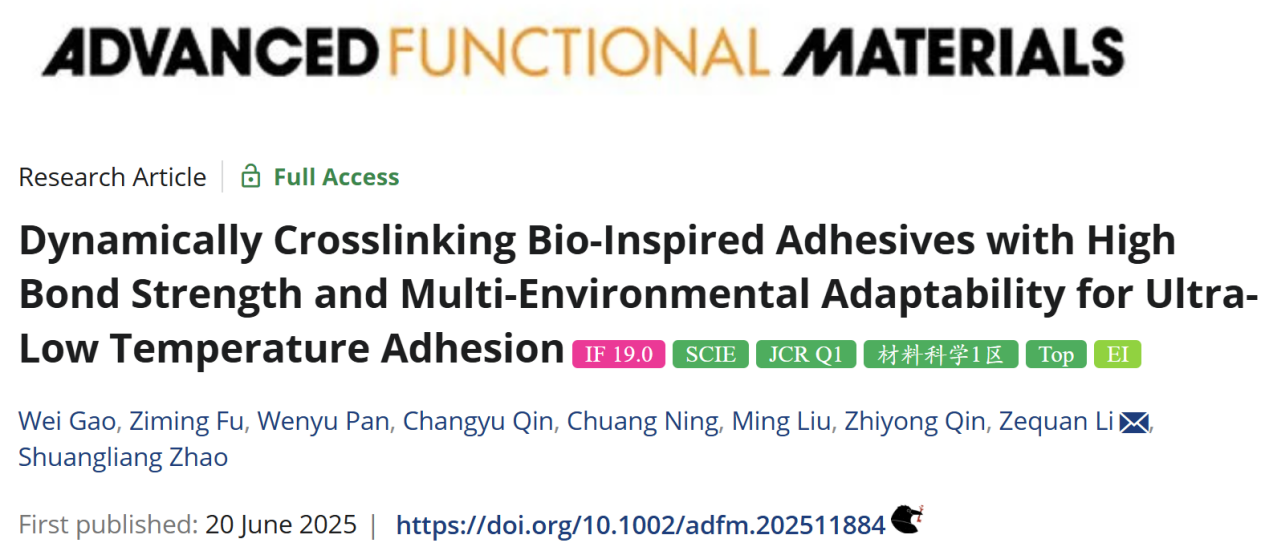 近日,我校结构热力学与微纳化工课题组在特种木材粘合剂的研制与应用方面取得新进展,研究成果以"Dynamically Crosslinking Bio-Inspired Adhesives with High Bond Strength and Multi-Environmental Adaptability for Ultra-Low Temperature Adhesion"为题发表在国际学术期刊Advanced Functional Materials上。该论文的第一作者为资源环境与材料学院副教授高伟,通讯作者为资源环境与材料学院助理教授李泽权,taptap苹果安装是唯一通讯单位。