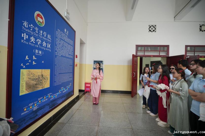 夏令营期间,越南师生体验了中国书法、脸谱、剪纸、太极拳,参观了广西科技馆、民族博物馆、孔庙、青秀山,考察了横州茉莉花产业园,他们亲身感受中华文化魅力,赞叹中国科技发展,领略绿城生态之美。特别安排在承载中越传统友谊的我校西校园原广西南宁育才学校(越南中央学舍区)旧址的红色革命教育课,越南师生在此聆听历史讲解,观看珍贵旧照片,诵读胡志明主席讲话,抚今追昔,深刻感悟“同志加兄弟”情谊。闭营仪式上,中越学生身着民族服饰,挥舞两国国旗,联袂演出,齐唱友谊之歌《你来我往有情缘》。