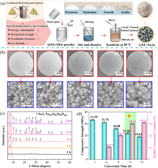 与传统分子筛材料需高温高压、依赖有机模板或二次成型的工艺不同,GXU-NaAs采用非水热原位合成技术,以地质聚合物技术为核心,首次实现无粘结剂制备高强度分子筛微球。该方法制备的GXU-NaAs具有卓越的机械性能:抗压强度达22.26 MPa,远超多数传统钠系分子筛材料;维氏硬度395.48,磨损率仅0.0087 %,可耐受动态吸附中的摩擦与冲击,避免结构破裂或粉碎,彻底解决了传统粉末沸石易堵塞、压降大的问题。同时,GXU-NaAs经500 KGy辐照照射后,仍能保留99 %的抗压强度和99 %的Cs+、Sr2+吸附容量,具有在核环境中保持优异稳定性的潜力。这项工作不仅解决了传统分子筛机械强度低、辐照后性能衰减及粉末材料易堵塞的问题,更为核废水高效净化提供了“高强度+耐辐照+高吸附”三位一体的解决方案。