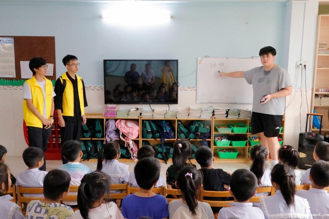 民族团结:语心相连共奋进。文学院实践团在凭祥狮子山社区开设推普课堂,孩子齐声诵读《少年中国说》,越南商户学“欢迎光临”等用语后笑称“沟通顺多了”。公共管理学院实践团在苍梧县幼儿园教孩子念《静夜思》,认“壮”“藏”等民族名称,播撒团结种子;教茶农讲好六堡茶故事,用普通话为特产打开市场。新闻与传播学院实践团走进百色市那坡县、靖西市,从融媒体中心的跨境传播实践,到非遗工坊的守正创新,在传统与创新中触摸民族动脉,探寻“讲好中国边境故事”的答案。资源环境与材料学院组织少数民族学生实践团赴广东,领略顶尖科研的魅力,将服务家乡、推动民族地区科技进步的信念根植于心。法学院实践团奔赴云南富宁县、广西那坡县,开展社区普法宣讲与校园法治课堂等活动,夯实边疆法治基础,为铸牢中华民族共同体意识贡献青春力量。
