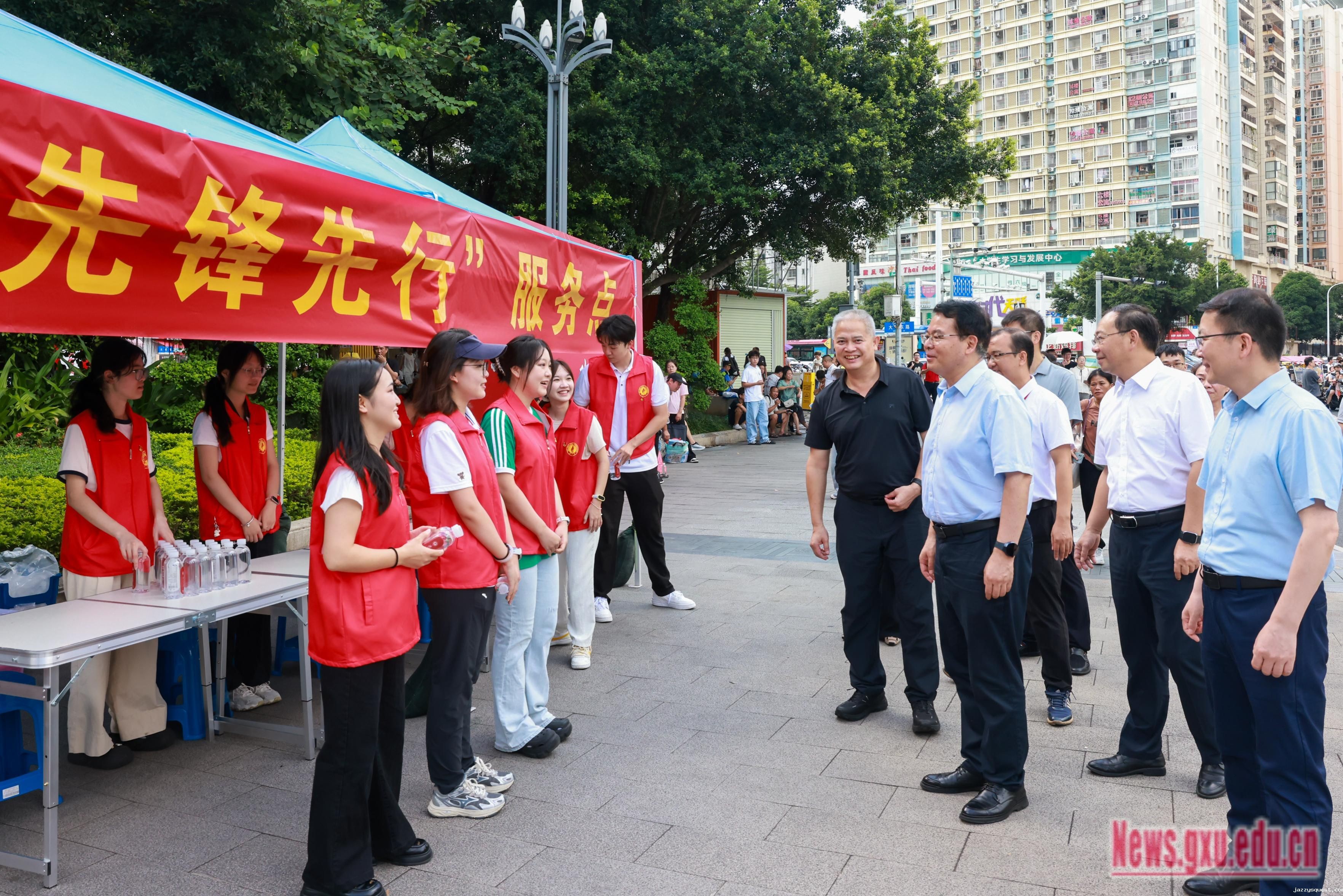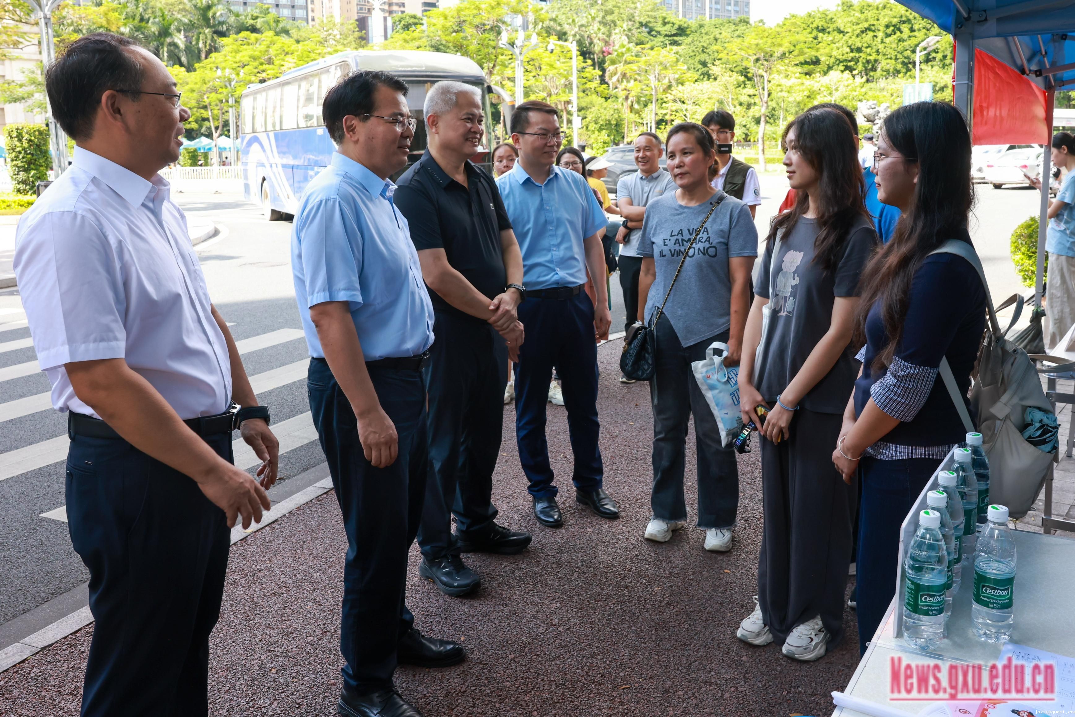 在南大门迎新点,李国忠详细了解新生入校报到流程,亲切慰问各岗位迎新工作人员和学生志愿者,对他们周到细致的服务表示肯定,感谢他们为迎新工作付出的辛勤努力。