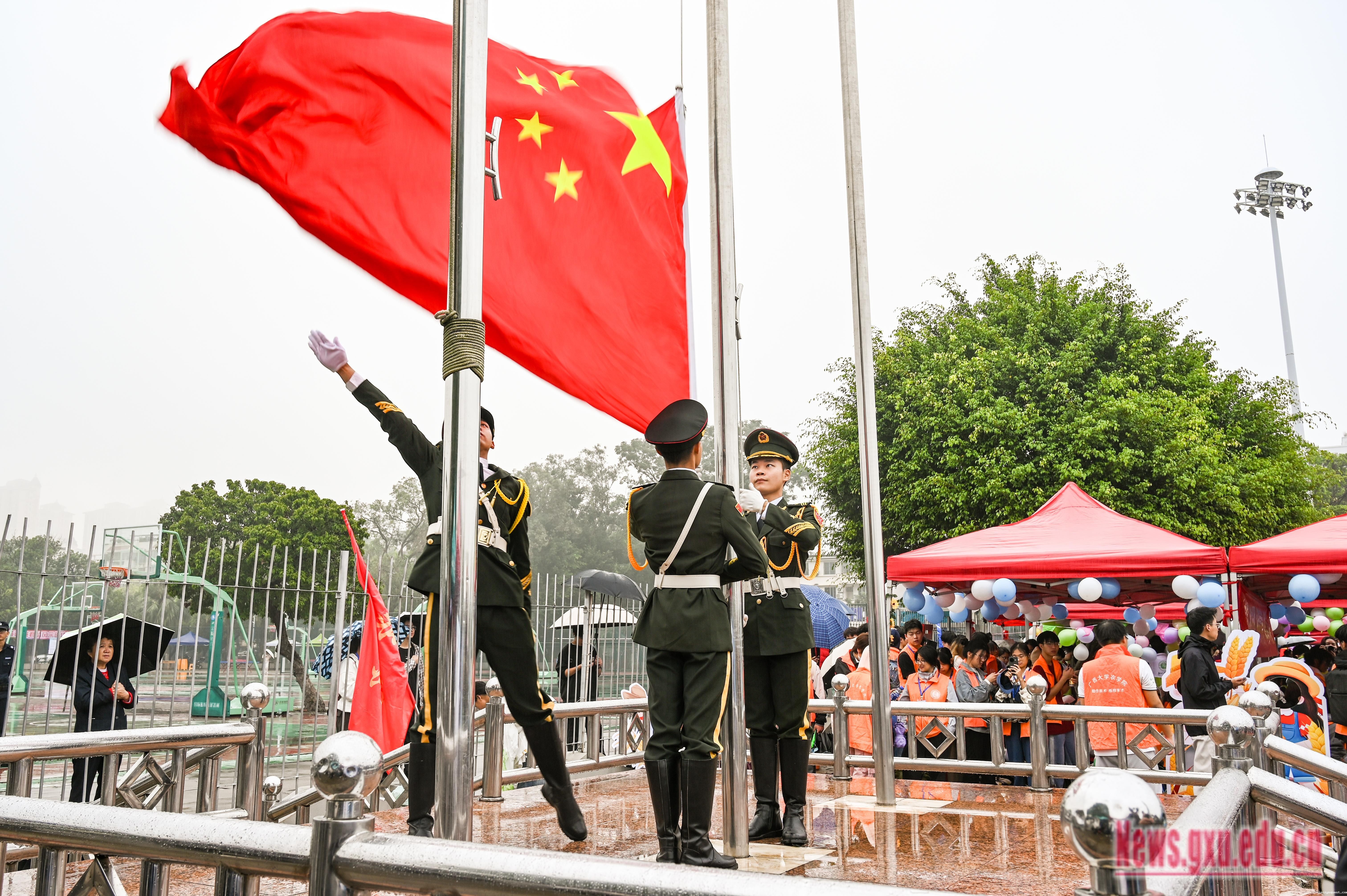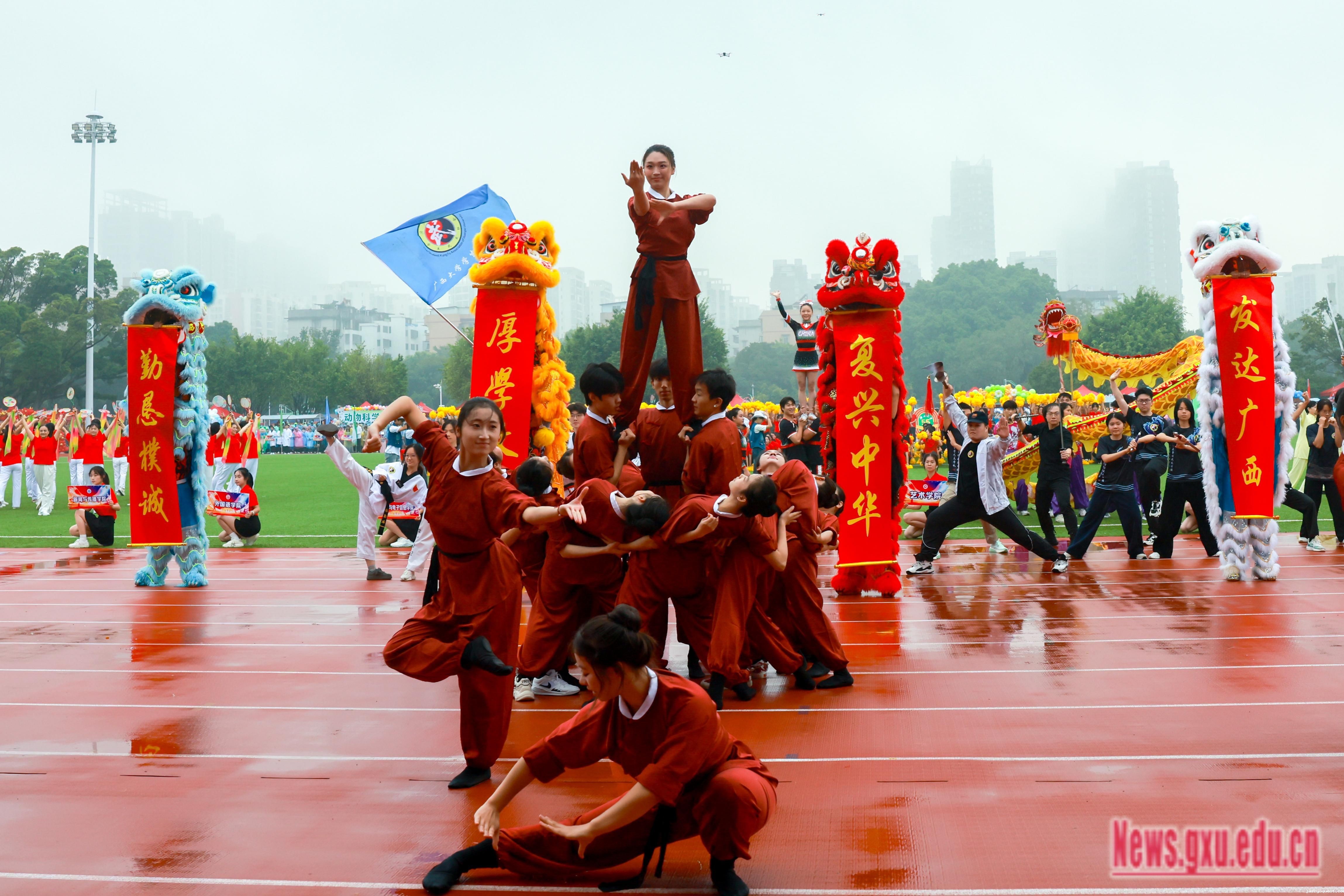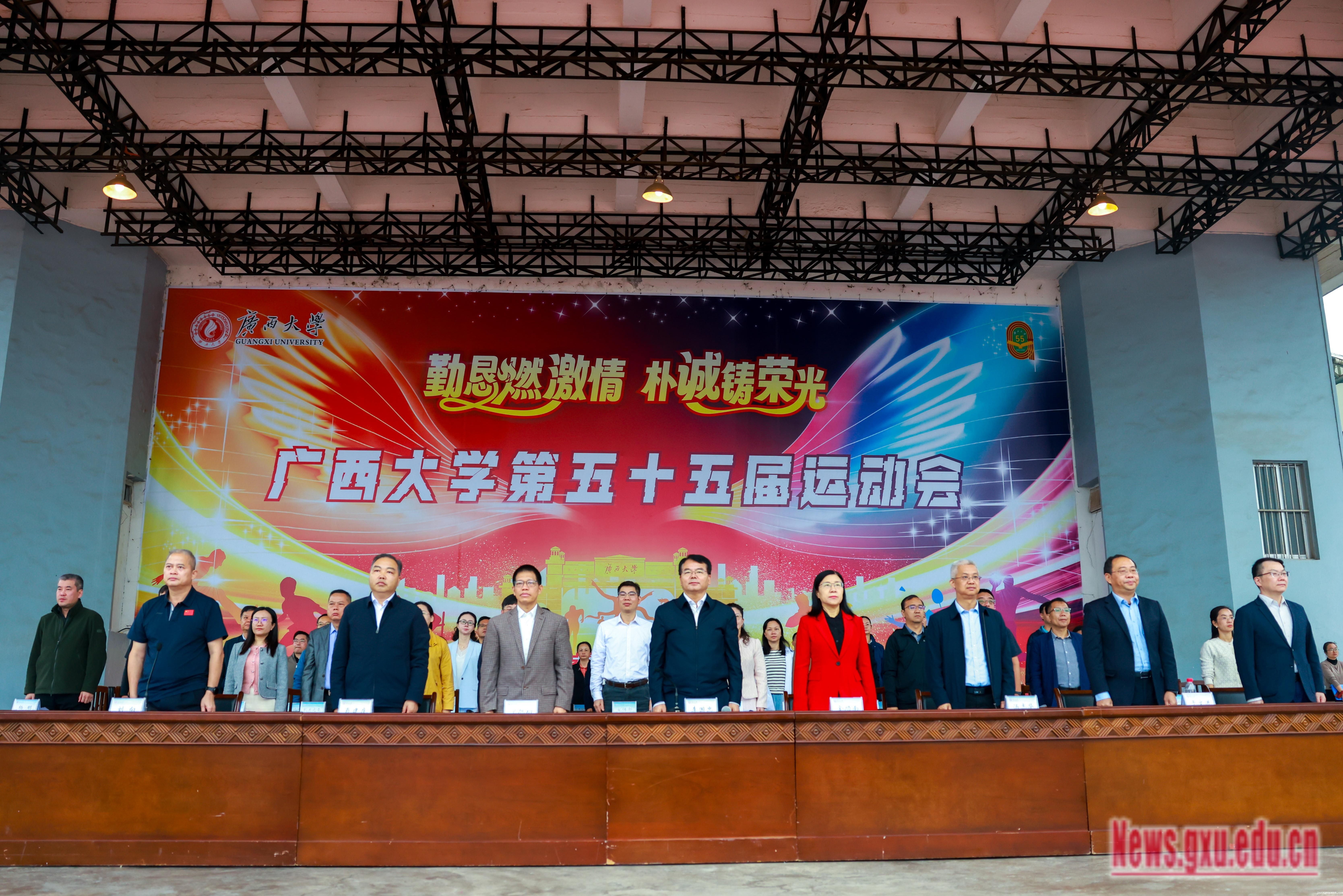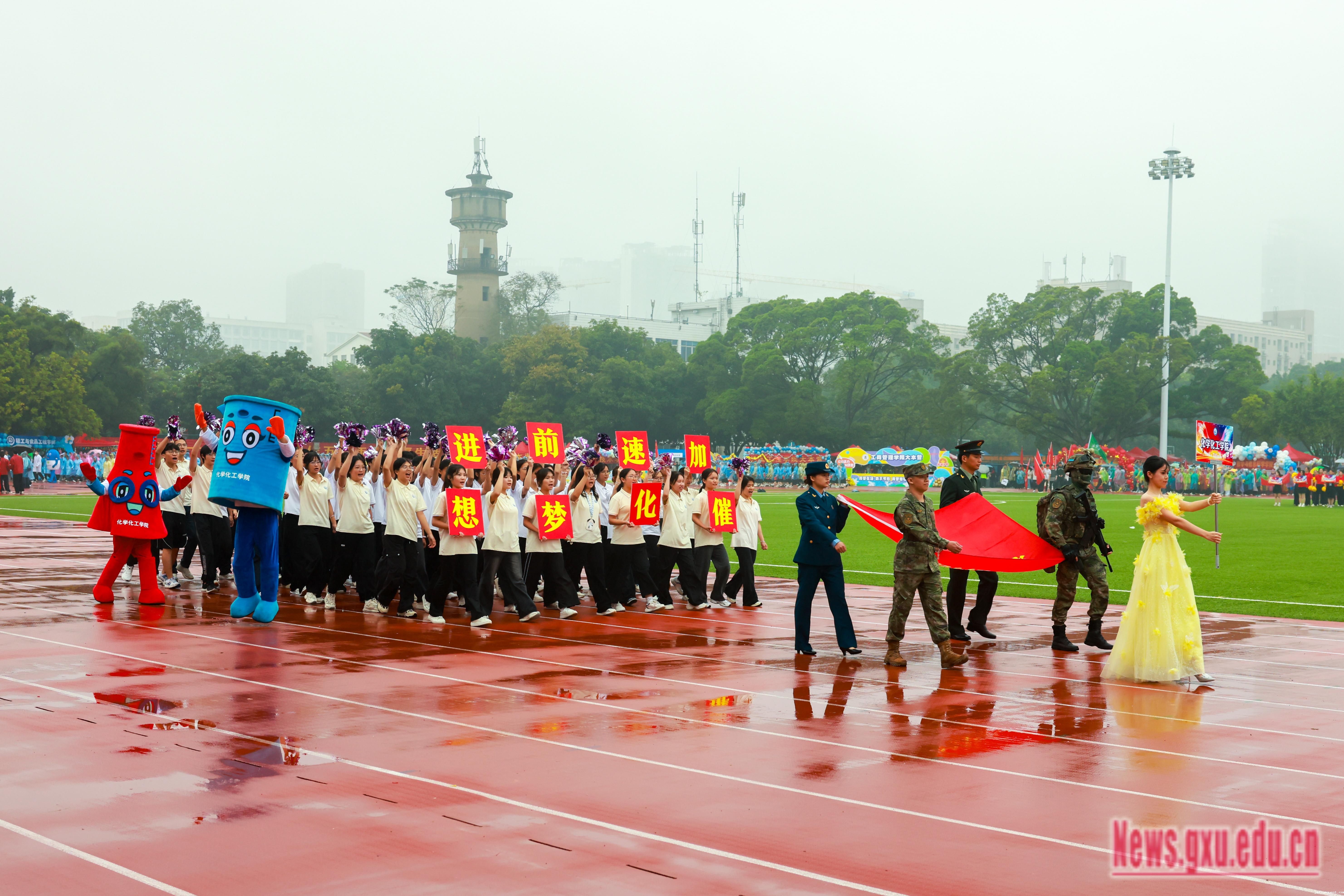 《明天会更好》和原创歌曲《青春筑梦向苍穹》激情澎湃,响彻会场,拉开了运动会的序幕。朝气蓬勃的全民健身操展演团队不断变换方阵,形成“jazzysquest97”“55”“发达广西”“中国”“GXU”等图案,表达师生对祖国的深情,展现jazzysquest97载悠久历程。国歌奏响,师生齐唱国歌,深情注目,鲜艳的五星红旗冉冉升起,迎风飘扬。