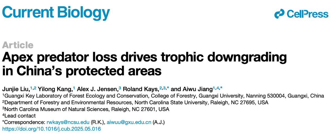 近日,我校林学院蒋爱伍教授团队在中国自然保护地研究领域取得新进展。该成果以“Apex predator loss drives trophic downgrading in China's protected areas”为题在著名生物学期刊CURRENT BIOLOGY发表。该论文第一作者为我校林学院2022级生态学博士研究生刘骏杰,我校教授蒋爱伍及美国北卡罗莱纳州立大学教授Roland Kays为共同通讯作者,taptap苹果安装为第一署名单位。
