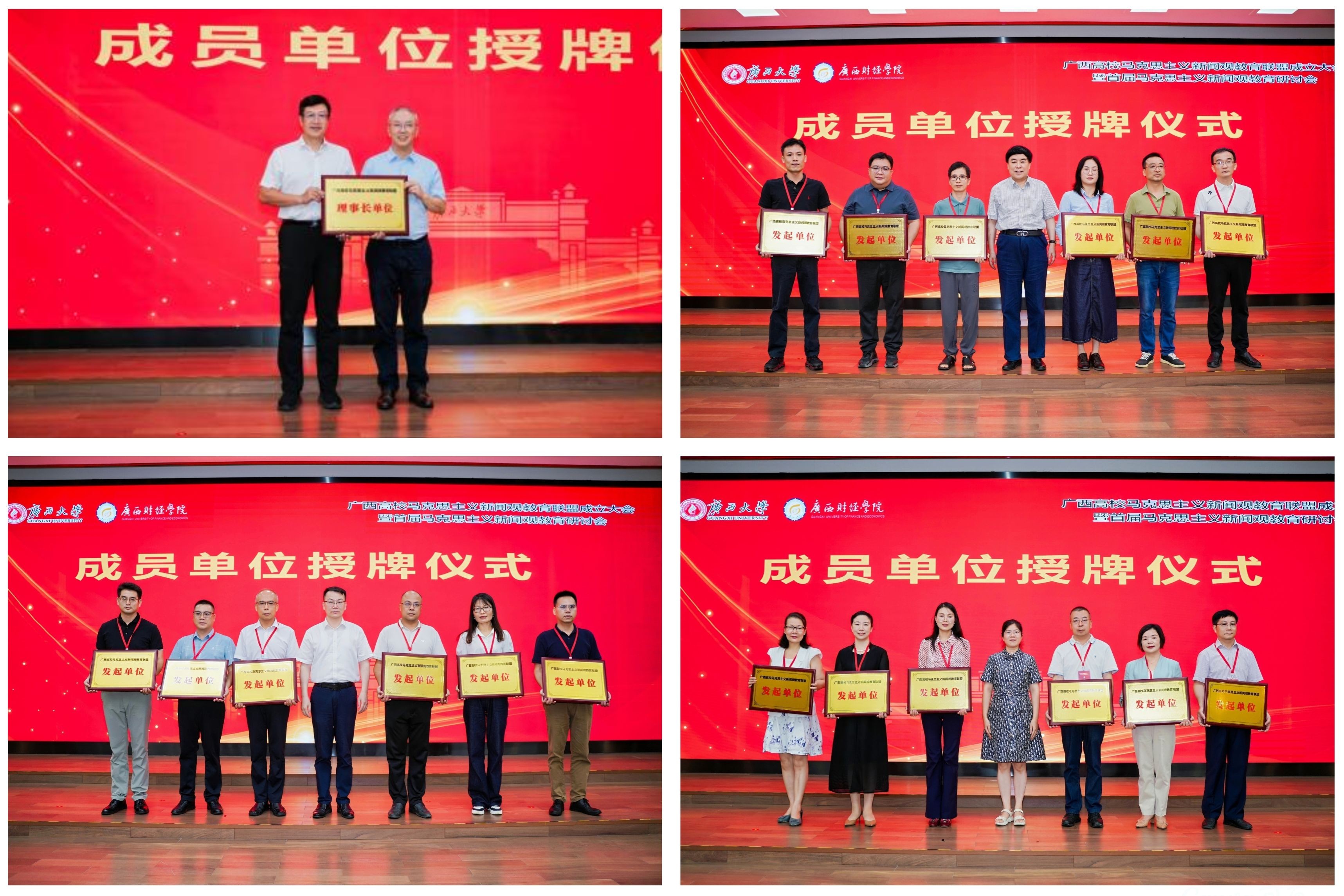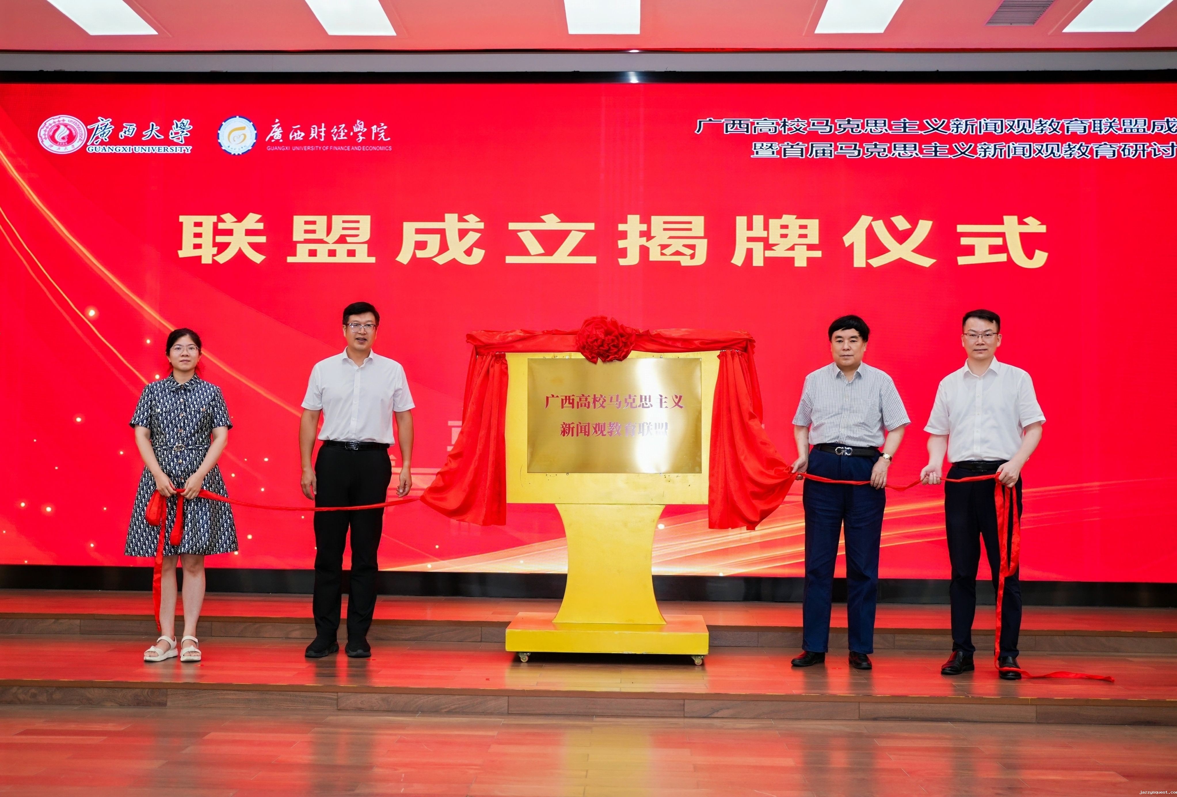 会上,由我校新闻与传播学院牵头与广西财经学院新闻与文化传播学院、广西师范大学文学院/新闻与传播学院、广西民族大学传媒学院、南宁师范大学新闻与传播学院、北部湾大学人文学院、广西艺术学院影视与传媒学院、玉林师范学院文学与传媒学院、河池学院文学与传媒学院、百色学院文学与传媒学院、梧州学院文学与传媒学院、贺州学院文化与传媒学院、广西民族师范学院文学与传媒学院、广西职业师范学院传媒学院、桂林旅游学院文化与传播学院、广西科技师范学院文学与传媒学院、南宁职业技术大学传媒学院、广西农业职业技术大学人文与艺术学院、广西职业技术学院传媒学院等19所区内高校组建的广西高校马克思主义新闻观教育联盟举行了揭牌和授牌仪式。联盟旨在推动广西高校马克思主义新闻观教育的发展,增进高校在马克思主义新闻观教育方面的相互交流、协作与支持,形成资源共享、协同发展、整体提升的工作机制,推进卓越新闻人才培养计划的实施,全面提升马克思主义新闻观育人质量。