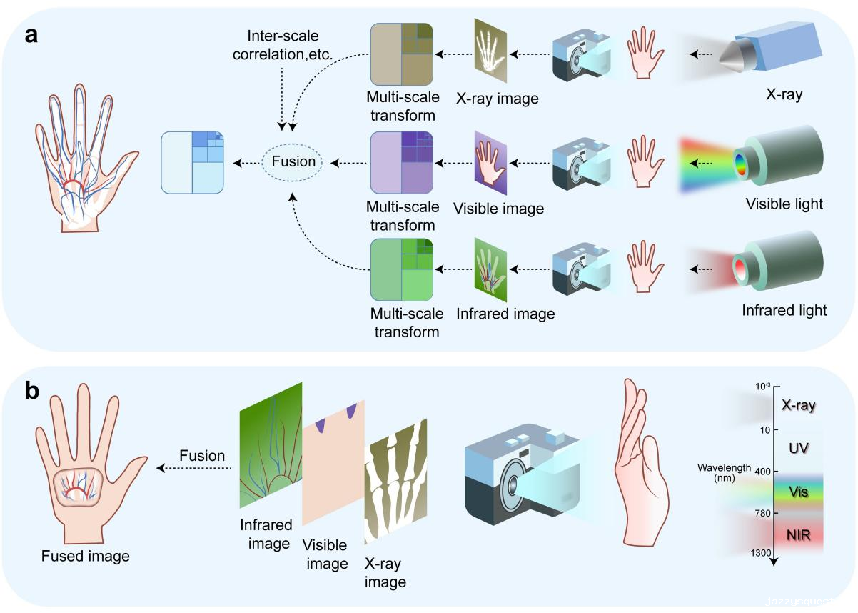 多光谱图像融合技术可以优化和整合不同类型的光谱,以获得更全面、可靠和丰富的特征数据,从而提高模型预测的准确性和稳定性。为此,彭辉等带领学生开发了一种具有超宽发射的新型Sb3+掺杂Zn2+基金属卤化物,成功在单一化合物中实现了高效的白光发射、近红外发射和X射线辐射发光。基于其独特的发光性质,成功实现了其在像素级多光谱图像融合中的应用。