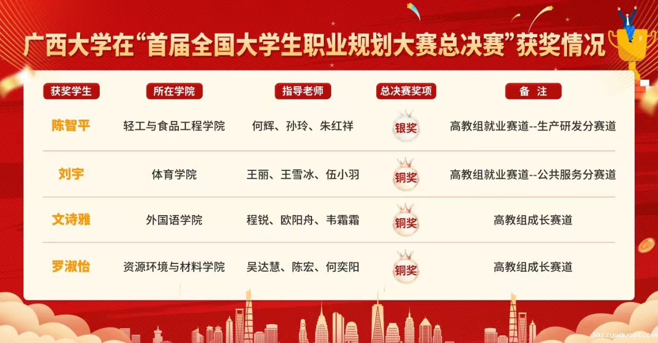 近日,教育部公布了首届全国大学生职业规划大赛全国总决赛获奖名单,我校参赛学生陈智平获得银奖,刘宇、文诗雅、罗淑怡获得铜奖。