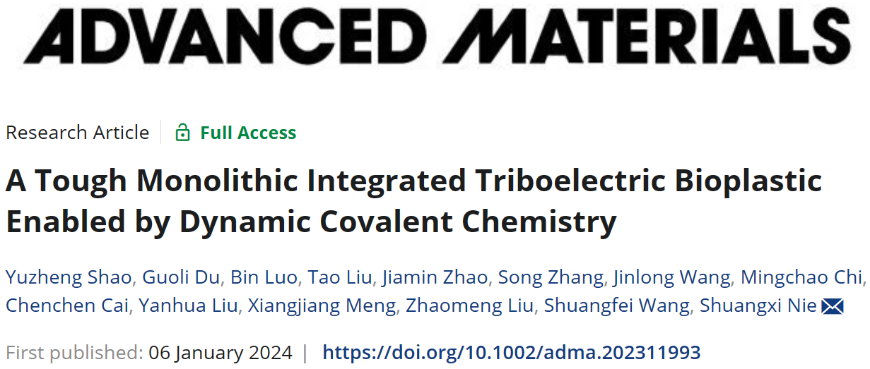 近日,我校轻工与食品工程学院王双飞院士团队在纤维素摩擦电材料研究中取得新进展。该研究基于纤维素优异的可降解性和摩擦电特性,通过动态共价化学的手段解决了绿色柔性电子产品中聚合物基材与导电涂层界面易剥离破碎的难题,为降低石油基电子废弃物的污染提供了思路。相关研究成果以“A Tough Monolithic Integrated Triboelectric Bioplastic Enabled by Dynamic Covalent Chemistry”为题发表于材料领域国际顶级学术期刊Advanced Materials。该论文的第一作者系轻工与食品工程学院硕士研究生邵宇正,通讯作者系轻工与食品工程学院教授聂双喜,我校为该论文的唯一完成单位。