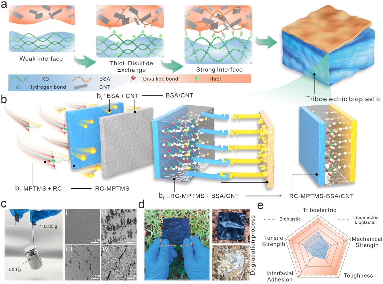电子废弃物对全球环境和人类健康的威胁日益严峻,引起了特别关注。以纤维素为原料的绿色电子产品是石油基电子产品的理想替代品。但在实际应用中机械不匹配的弱粘合界面,将严重影响柔性纤维素摩擦电材料的电子传输效率,导致传感器件的失效。针对这一挑战,王双飞院士团队采用动态共价化学诱导界面互锁的策略,利用硫醇-二硫键交换反应的化学选择性和位点特异性,制备了一种可降解的单片集成式摩擦电生物塑料。通过动态共价键适应界面相互作用的方式耗散应力,使绿色电子产品中介电层与导电层实现有效的界面黏附。这种单片集成式的摩擦电生物塑料与传统电子材料相比,可在不需额外电极贴片的情况下进行稳定工作,并在复杂环境中展现出良好的力学性能。